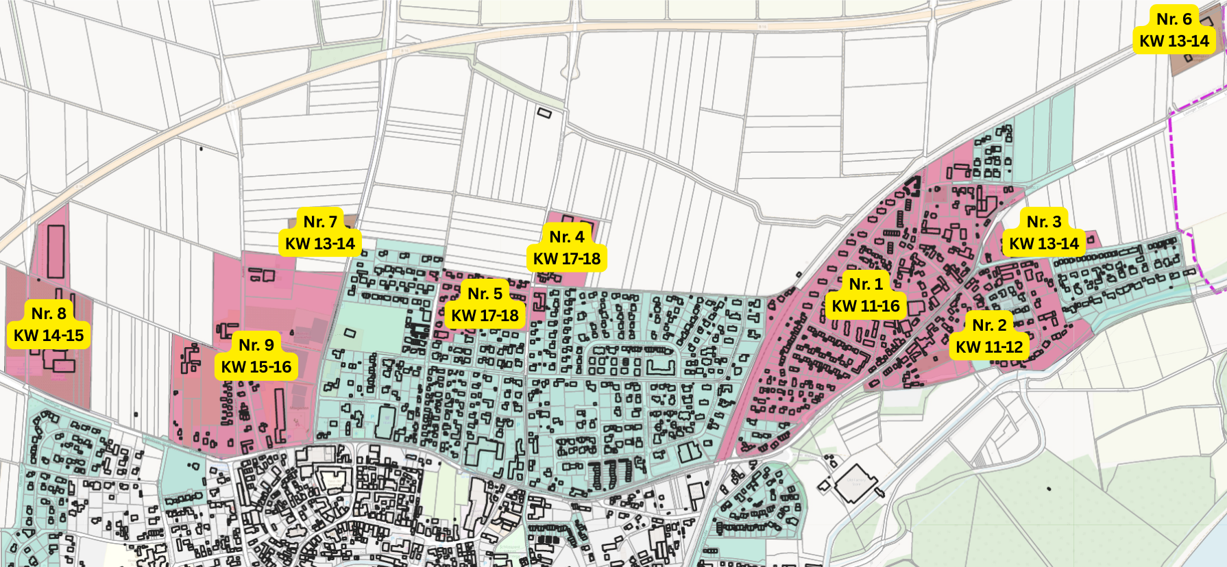Die Aufnahme der Bebauungsplangebiete wird voraussichtlich Anfang März abgeschlossen sein. Im Anschluss daran werden die Gebiete aufgenommen, in denen kein rechtskräftiger Bebauungsplan gilt (sog. unbeplanter Innenbereich). Die ersten aufzunehmenden Gebiete ohne Bebauungsplan wurden wie folgt terminiert:
